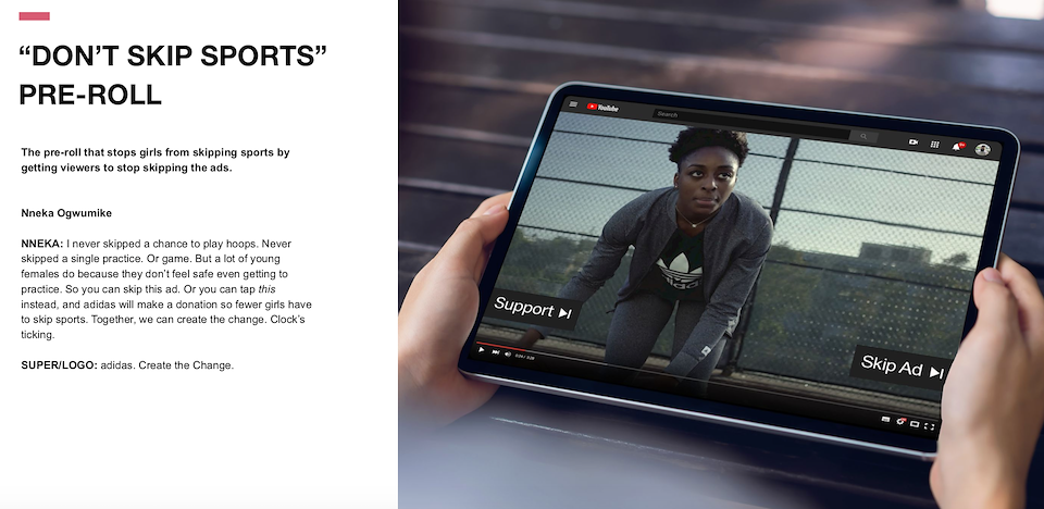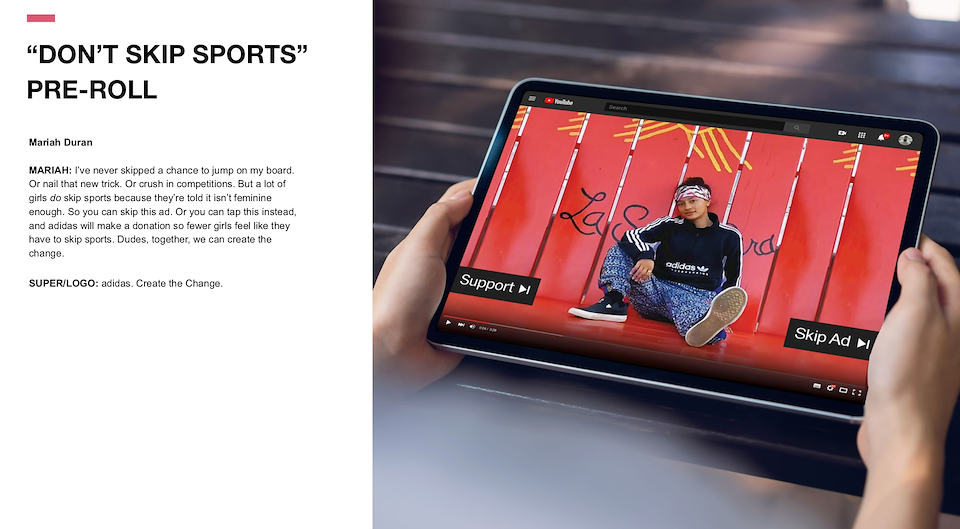 For the Tokyo Olympics, Adidas wanted a campaign in which their female athletes spoke to the importance of girls playing sports. After all, girls who play sports are twice as confident as those who don’t. But by age 15, more than half of girls stop playing sports altogether. So, how did we convince the world of the importance of girls not skipping out on sports? Adidas bought a pre-roll execution I came up with, which utilized the “skip ad” prompt. The pre-roll spots urged people not to skip the ad, and to instead contribute to girls' sports.